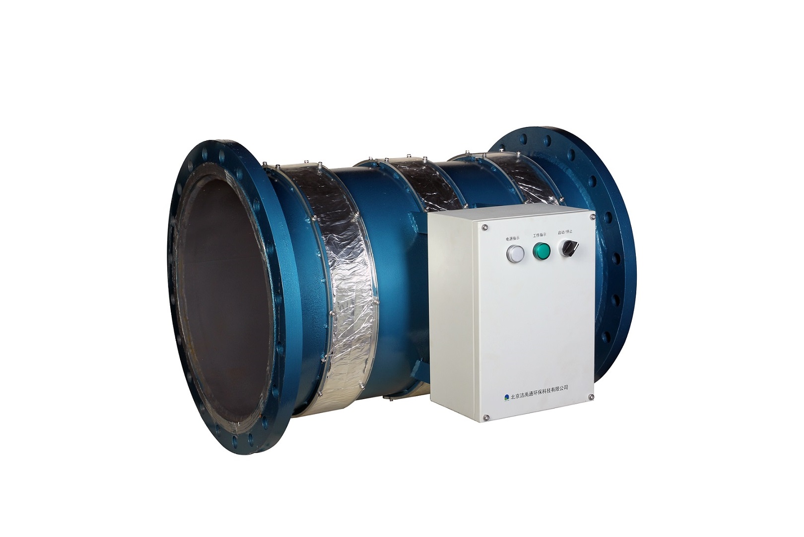 广谱感应水处理器,通过中心微处理器,将输入电源信号转换为高频脉冲电流,利用管路缠绕线圈感应产生振荡磁场,以预先设计好的与流体相配的频率与电流信号扫过水流,利用物理方法达到除垢除垢、防垢、缓蚀、防腐、杀菌、除藻的效果。